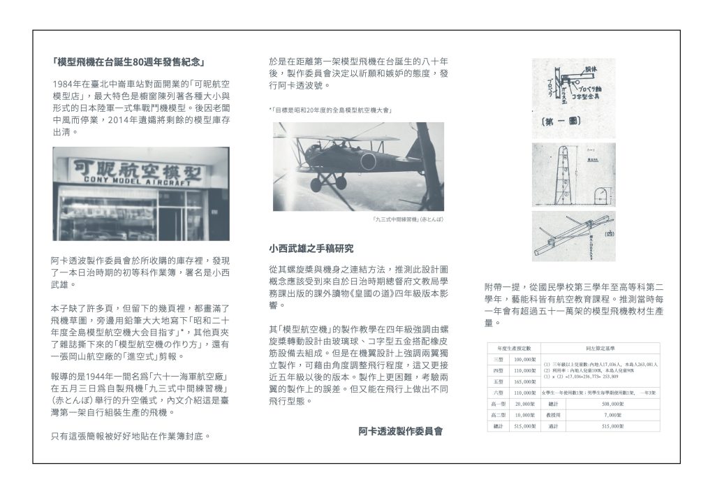 過去模型曾經乘載著軍國主義,現在人們則透過製作模型,展現詮釋歷史的慾望。「阿卡透波委員會」是與歷史現場若即若離的我們,以日本時代航空模型教具為原型,將航空工廠製造紅蜻蜓(AKATONBO)飛機的過去,用現代模型玩具的形式,編織不見於主流歷史的碎片與自身經驗,試圖重新「製作」與「組裝」屬於當下的模型飛機「阿卡透波」。